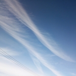 この雲も、飛行機雲が太く変形したものだと思います。ねじれたり巻き込んだようなものは、飛行機雲の特徴の一つです。